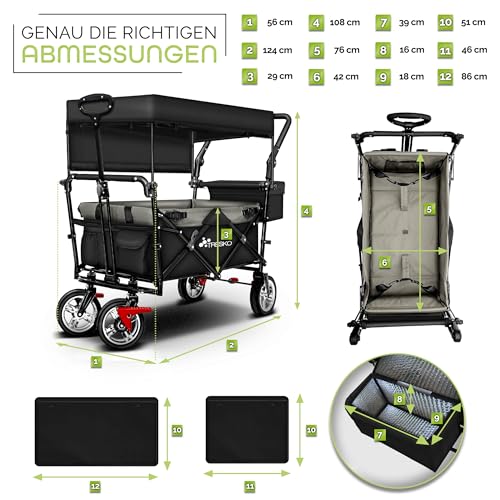 TRESKO Bollerwagen faltbar mit Dach, Kühltasche & Seitenrollos | Handwagen mit 3-Punkt Gurtsystem | Gartenwagen klappbar | Transportwagen mit Vollgummi-Reifen + Bremse + Tragetasche (Schwarz)