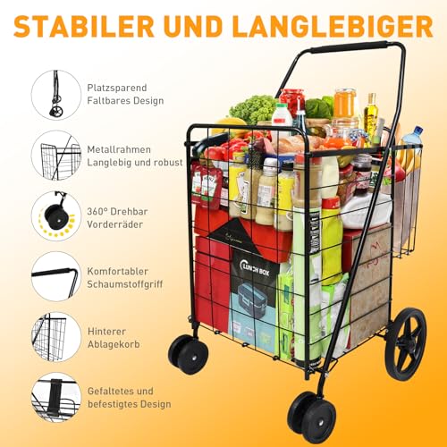 【Hinterer Ablagekorb】Dieser Einkaufswagen verfügt über einen zusätzlichen hinteren Korb an Stelle zusätzlichen Stauraum. Maße des großen vorderen Korbs: 45 x 39 x 53 cm, Maße des hinteren Korbs: 45,6 x 15,5 x 34,3 cm. Ermöglicht Ihnen, Ihre Brieftasche, Jacke, Ihren Regenschirm oder alternative persönliche Gegenstände griffbereit und stabil vor sich abzulegen.