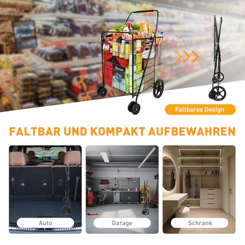 【Einfach Aufzustellen und Zusammenzuklappen】Dieser Einkaufswagen mit Rädern lässt sich einfach flach zusammenklappen und kann in Sekundenschnelle ohne Werkzeug aufgestellt und zusammengeklappt werden. Bleibt mit einem Riegel geschlossen, überaus praktisch und nimmt im zusammengeklappten Zustand abzgl. Platz ein.