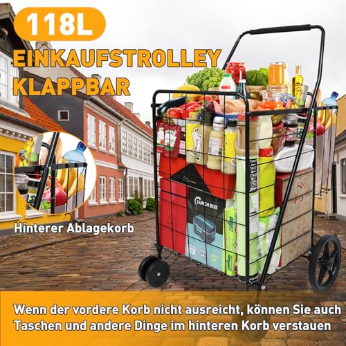 Trolley Einkaufstrolley Klappbar, Transport Trolley, bis 60 kg, 118 l Kiste, Jumbo-Einkaufswagen mit Doppelkörben, Allzweckwagen für Lebensmittel, Wäsche, Bücher, Schwarz