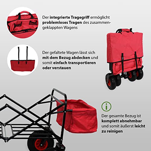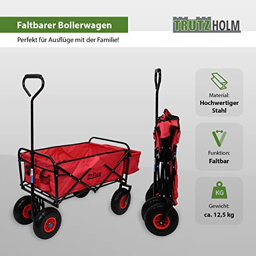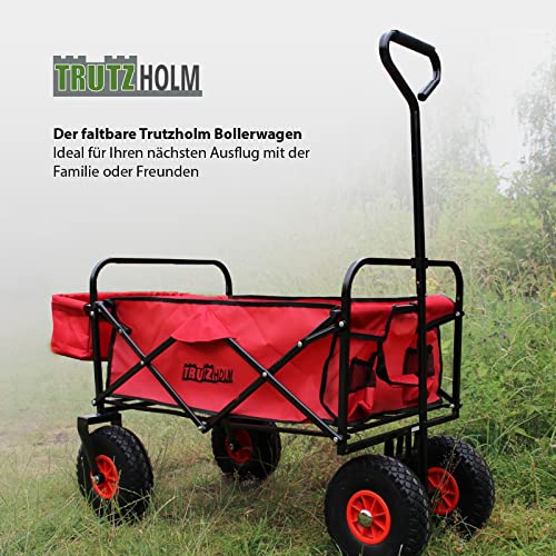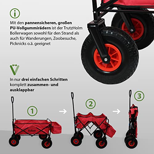 TRUTZHOLM Bollerwagen faltbar | 80 Liter | 4 PU Räder | Platzsparend | Orange | Gartenwagen Transportwagen Handwagen Strandwagen Kinderbuggy Ausflug Einkauf (Rot, ohne Dach)