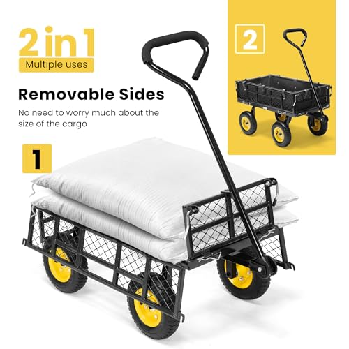 Abnehmbare Seiten: Der VIVOHOME-Gartenwagen lässt sich durch einfaches Entfernen der Seiten in wenigen Minuten in einen flachen Wagen verwandeln, was das Laden von Gegenständen noch einfacher macht. Gleichzeitig können Sie auch Gegenstände mit größerem Umfang auf dem Tablet platzieren, ohne durch den Rahmen eingeschränkt zu werden.