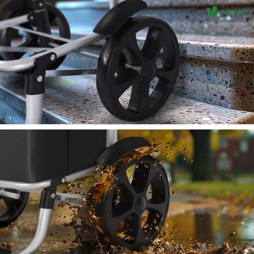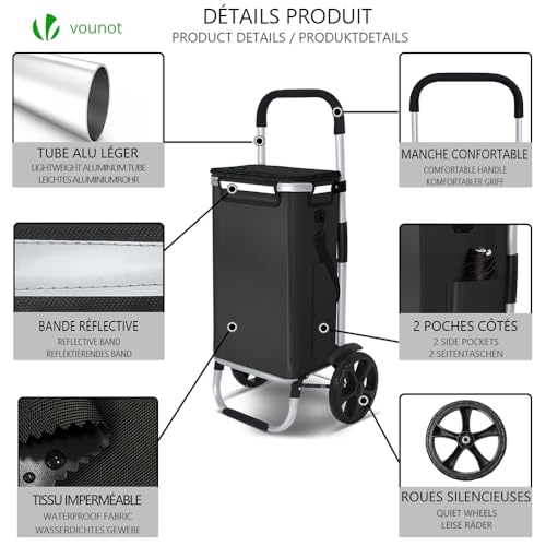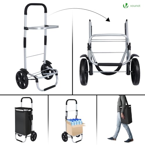 VOUNOT Einkaufstrolley Klappbar aus Aluminium mit 50L Wasserdichter Tasche und Kühlfach, 2 Extra große Räder mit Schutzblech, Faltbarer Einkaufswagen, Treppensteiger Trolley, Schwarz