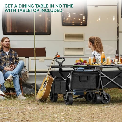 KLAPPBARER WAGEN MIT TISCHPLATTE – Genießen Sie eine praktische Essfläche beim Camping aufgrund des leicht zu installierenden tragbaren Tischdesigns des Gartenwagens, das über eine Kapazität von 55 Pfund verfügt, die statt dessen all Ihre Speisen und Getränke mehr wie ausreichend ist. Zwei Becherhalter und abnehmbare Seitentaschen sind vorhanden, um bequemen Abruf und Aufbewahrung von Getränken zu ermöglichen